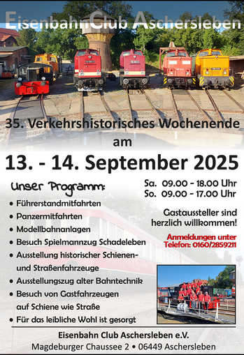 Der Eisenbahn Club Aschersleben e. V. lädt zur 13. Ausgabe seines beliebten Eisenbahnfestes. Dabei werden auf dem Gelände viele eigene Fahrzeuge und auch Gastfahrzeuge präsentiert. Jeder Fahrer, der das Fest mit einem Oldtimer besucht erhält freien Eintritt. Egal, ob das Fahrzeug aus dem Osten oder Westen stammt, und ob mit Moped oder LKW. Alles ist gern gesehen.